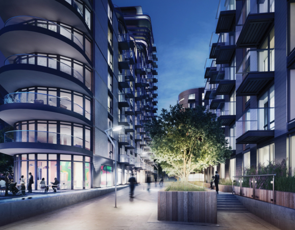 The five-block mixed-use development is 20 storeys in height and has 379 apartments adjacent to East London's historic Tobacco Dock. It features a curved fa4tade and sculptured terracing. The scheme contributes positively to its local surroundings and has acted as a catalyst for other improvements in the area including the re-launch of a local events venue and the development of the site adjacent to the scheme by a major bank.